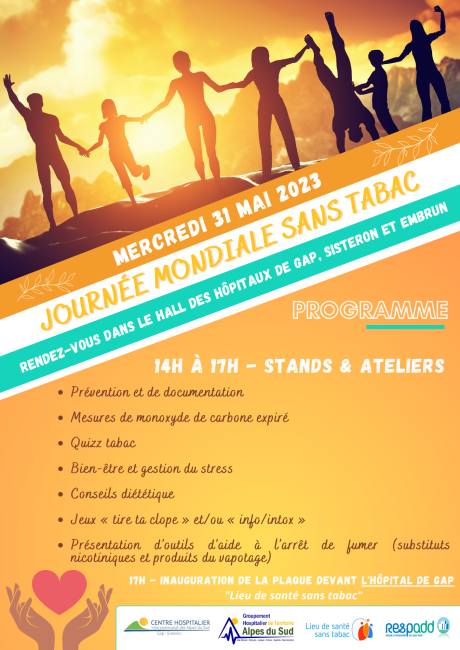 Le 31 mai 2024, un stand sera tenu dans la hall d'entrée de l'hôpital de Gap, pour la Journée Mondiale Sans Tabac. Au programme : prévention, aide au sevrage ...